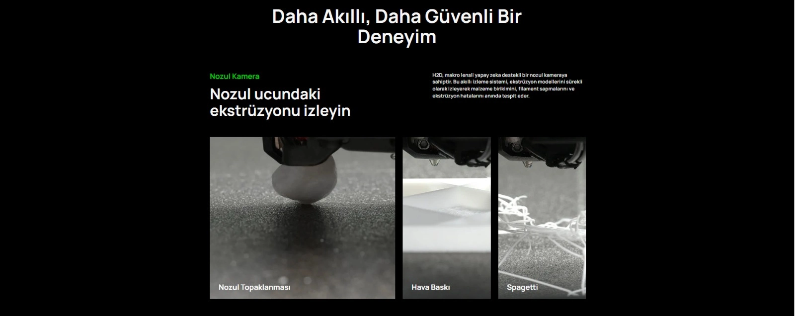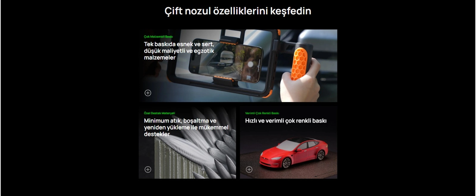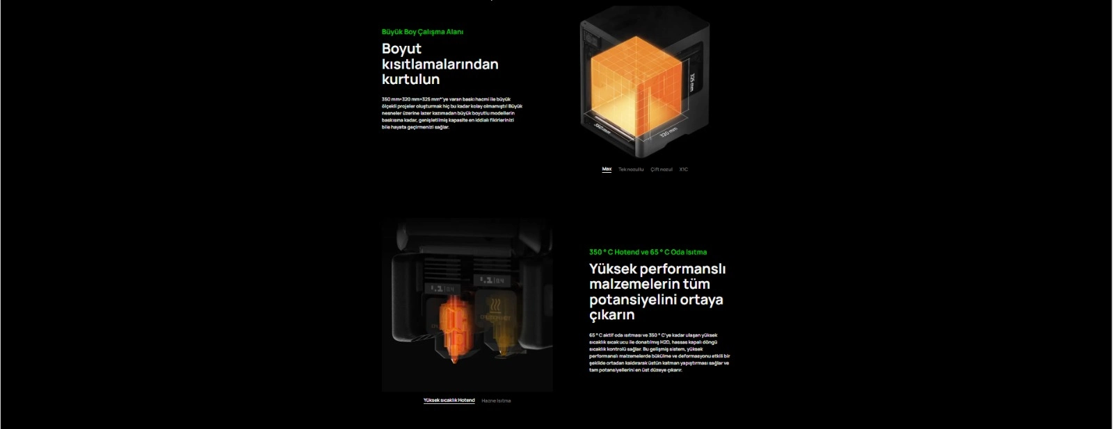 PLA; PETG; TPU; PVA; BVOH; ABS; ASA; PC; PA; PET; Karbon/Cam Elyaf Takviyeli PLA, PETG, PA, PET, PC, ABS, ASA, PPA-CF/GF, PPS, PPS-CF/GF |