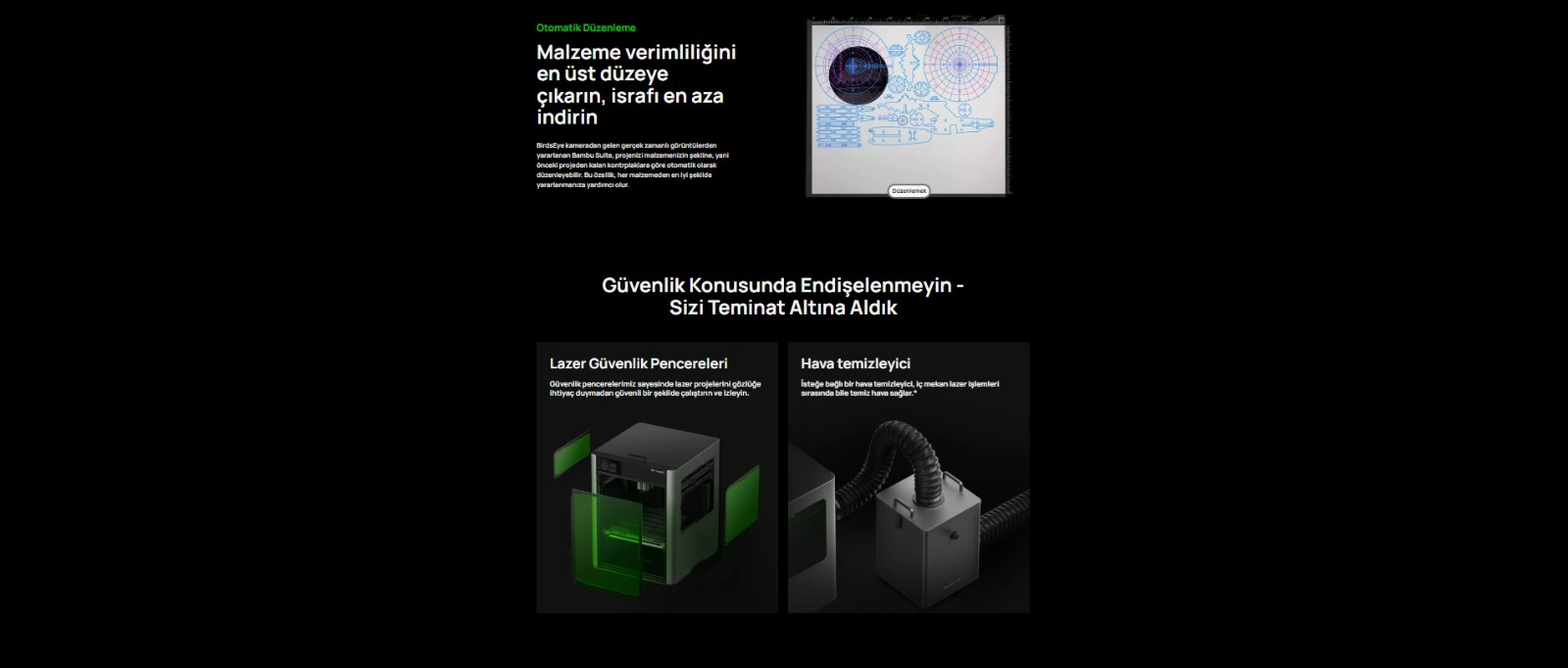 Bambu Studio; Bambu Suite; Bambu Handy; üçüncü taraf dilimleyiciler (Super Slicer, PrusaSlicer, Cura) desteklenir |